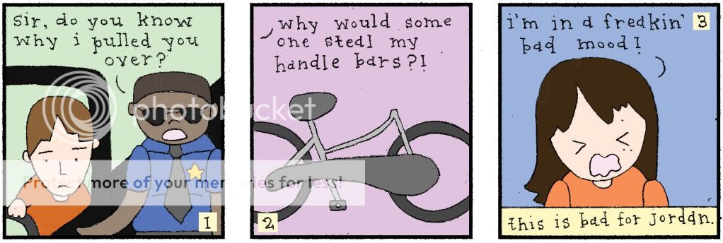 Things turned out pretty good ... I mean we found a $25 defensive driving course ... and I'm not so cranky anymore. Still don't know what to do about my bike. But it's cool because I don't really know how to ride it. (My legs are too short.)